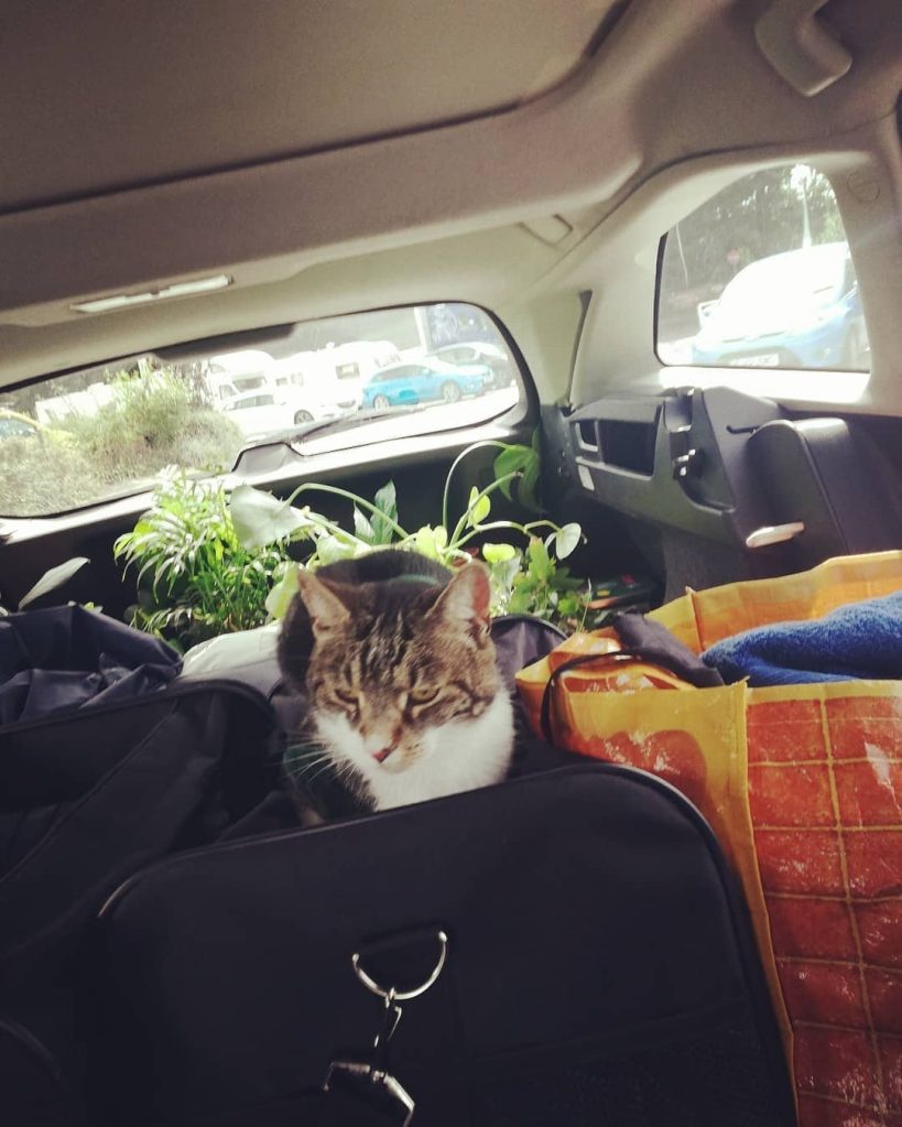 “P’s had a bit of break down on a litter tray break once she clocked the other cars moving and now she’s tried to bury herself under the pot plants”